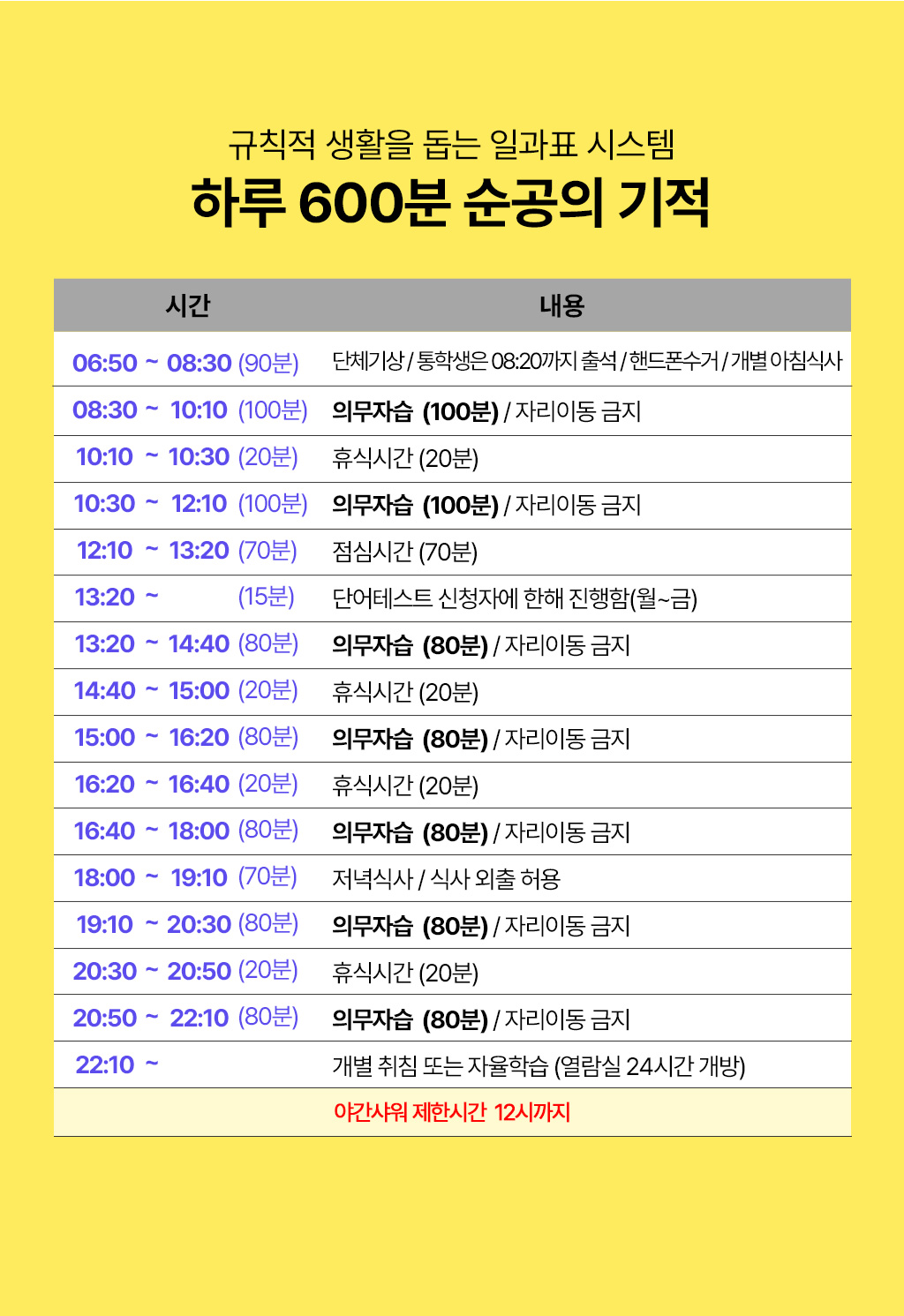 매일 100분 자습, 15분 휴식 시스템으로 규칙적인 생활패턴과